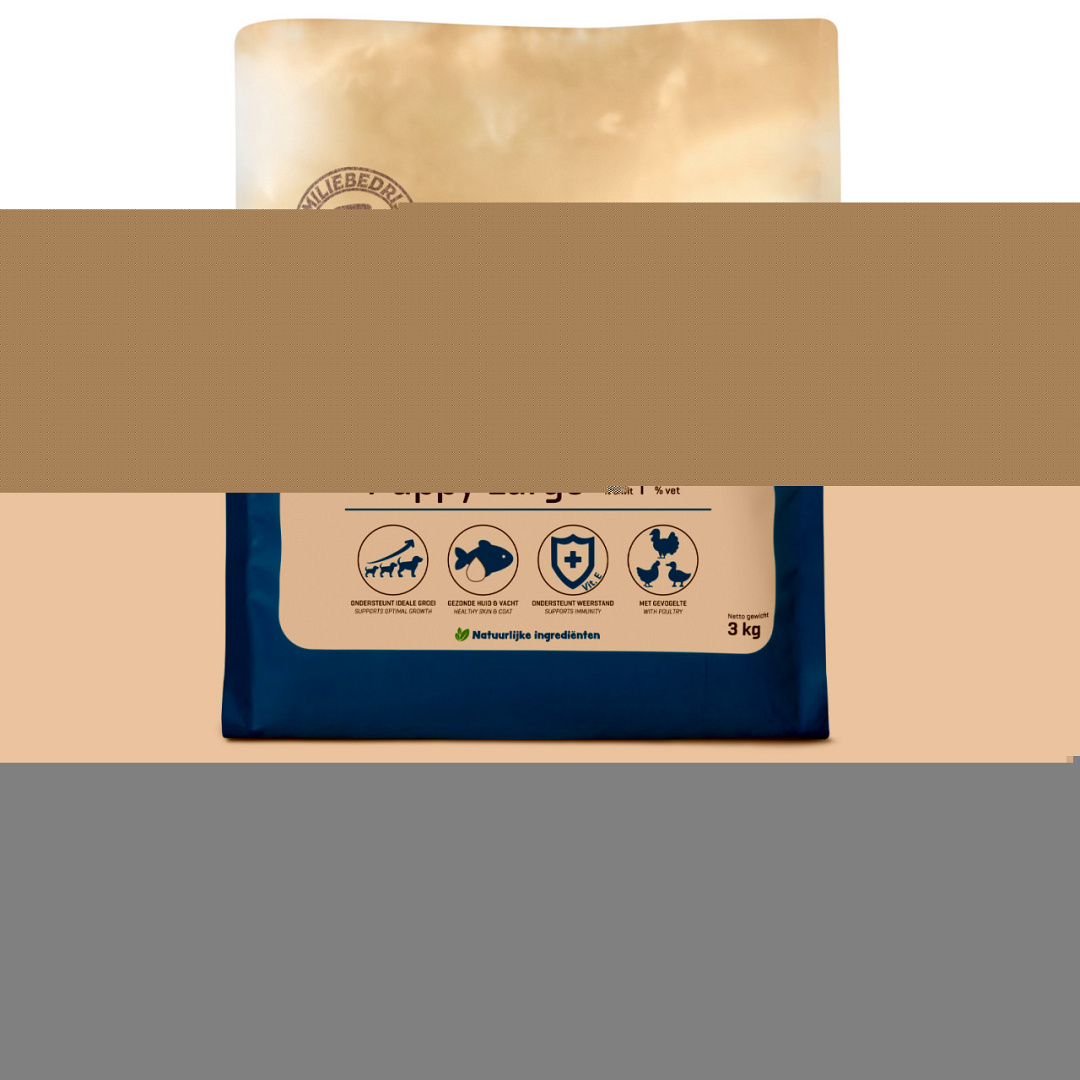 Heb je een pup van een middelgroot ras? Dan kun je wanneer je pup de leeftijd van 5 maanden heeft bereikt, overstappen naar CaroCroc Puppy Large. Dit kun je vervolgens blijven voeren t/m een leeftijd van 12 maanden. Pups van grote rassen kunnen direct vanaf 4 weken starten met CaroCroc Puppy Large totdat ze de volwassen leeftijd van 15 maanden bereikt hebben.