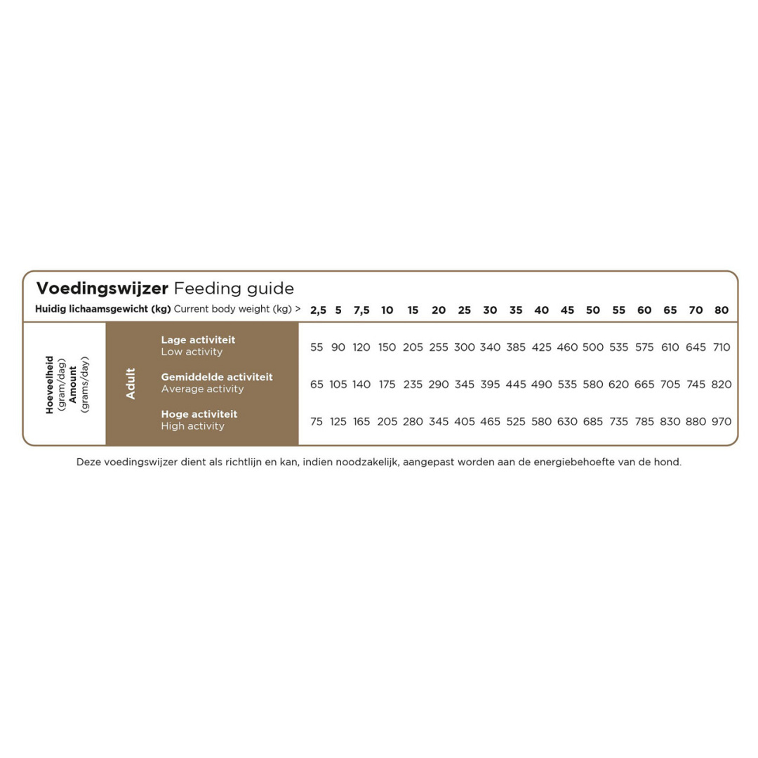 Analytische bestanddelen: Vocht 8,0%, ruw eiwit 22,5%, ruw vet 12,0%, ruwe as 5,5%, ruwe celstof 4,5%.