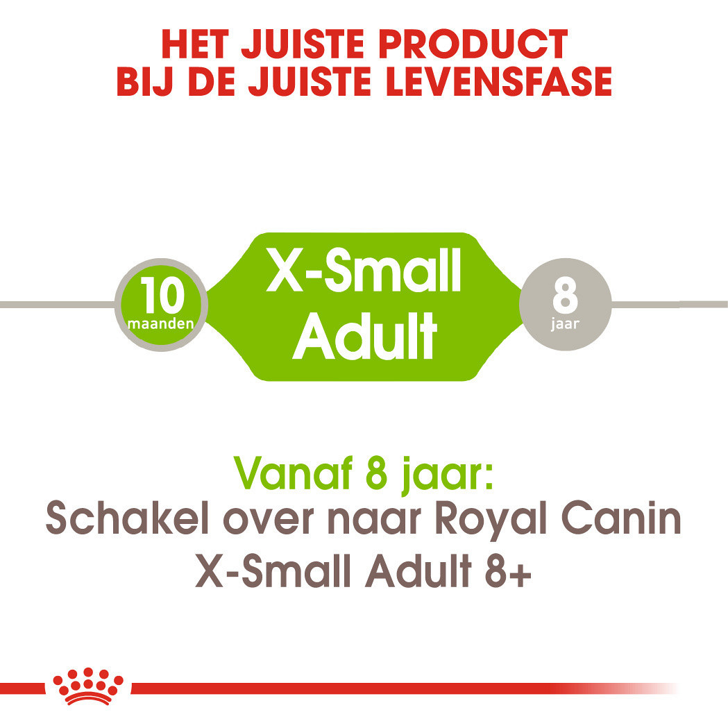 Op basis van de nieuwste wetenschappelijke mogelijkheden heeft Royal Canin X-Small Adult voeding ontwikkeld. De op maat gemaakte brokjes X-small Adult passen perfect bij zijn kleine kaak. Ze bevatten voedingsstoffen die voldoen in de energiebehoefte en ondersteunen een gezonde huid en vacht. X-small Adult zorgt voor een goede kwaliteit ontlasting. Ook ondersteunt het de urinewegen en helpt het tandsteen voorkomen. Kleine brokjes hebben een groot resultaat. Kijk maar eens hoe levenskrachtig je hond is!