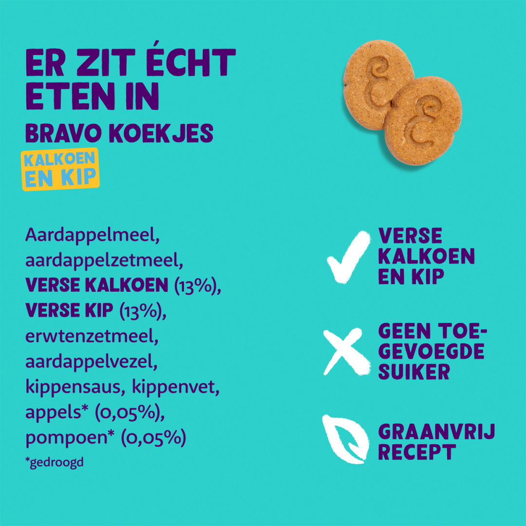 Ingrediënten: verse kip 58%, verse kalkoen 12%, erwtenzetmeel, plantaardige glycerine, aardappelmeel, erwtenvezel, mineralen, banaan (gedroogd) 0,05%, pompoen (gedroogd) 0,05%.