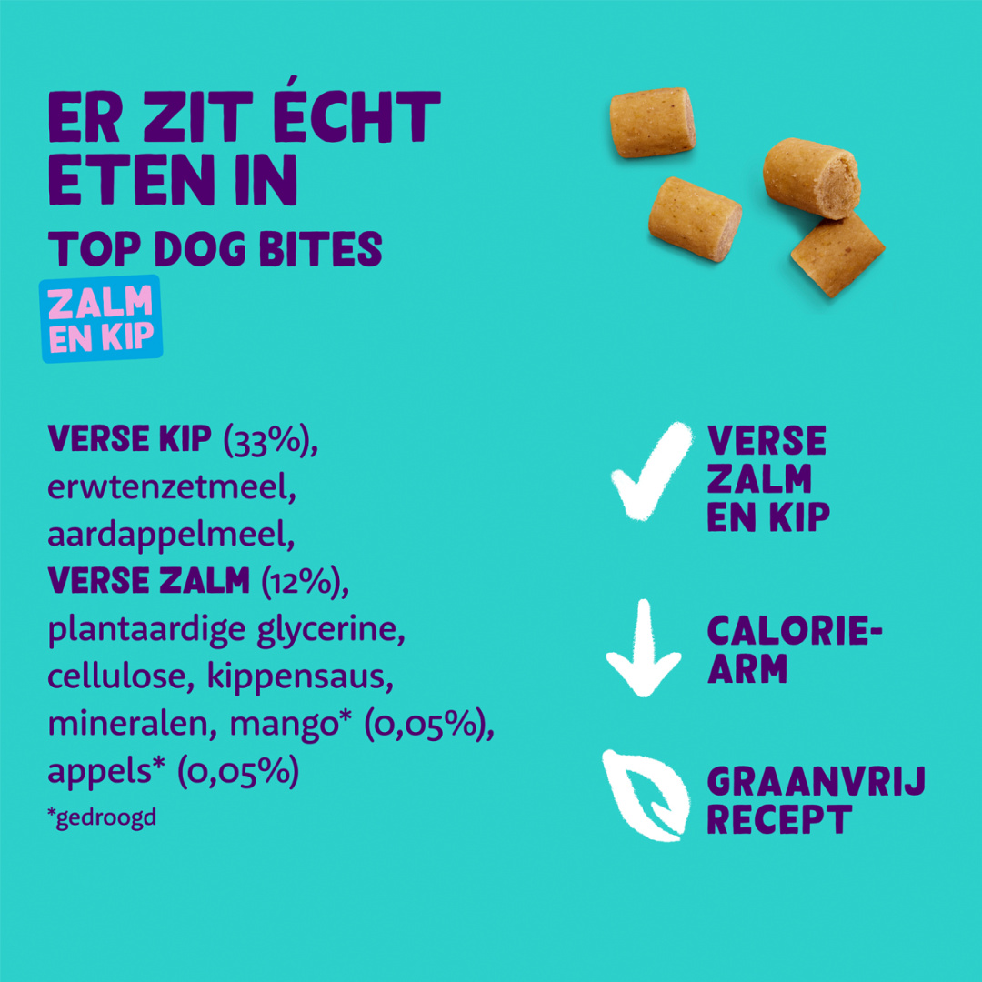 Ingrediënten: verse kip 33%, erwtenzetmeel, aardappelmeel, verse zalm 12%, plantaardige glycerine, cellulose, kippensaus, mineralen, mango (gedroogd) 0,05%, appels (gedroogd) 0,05%.
