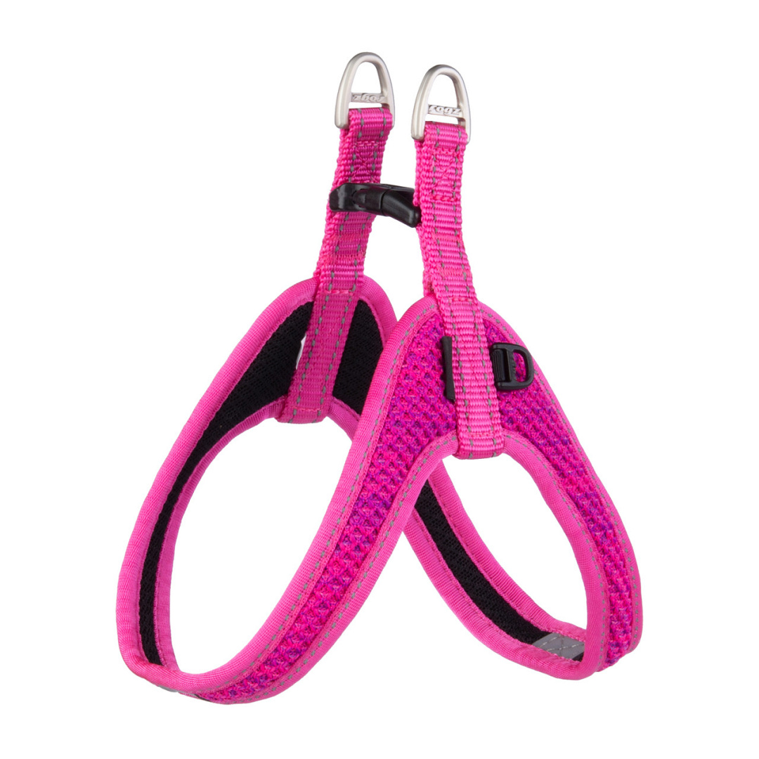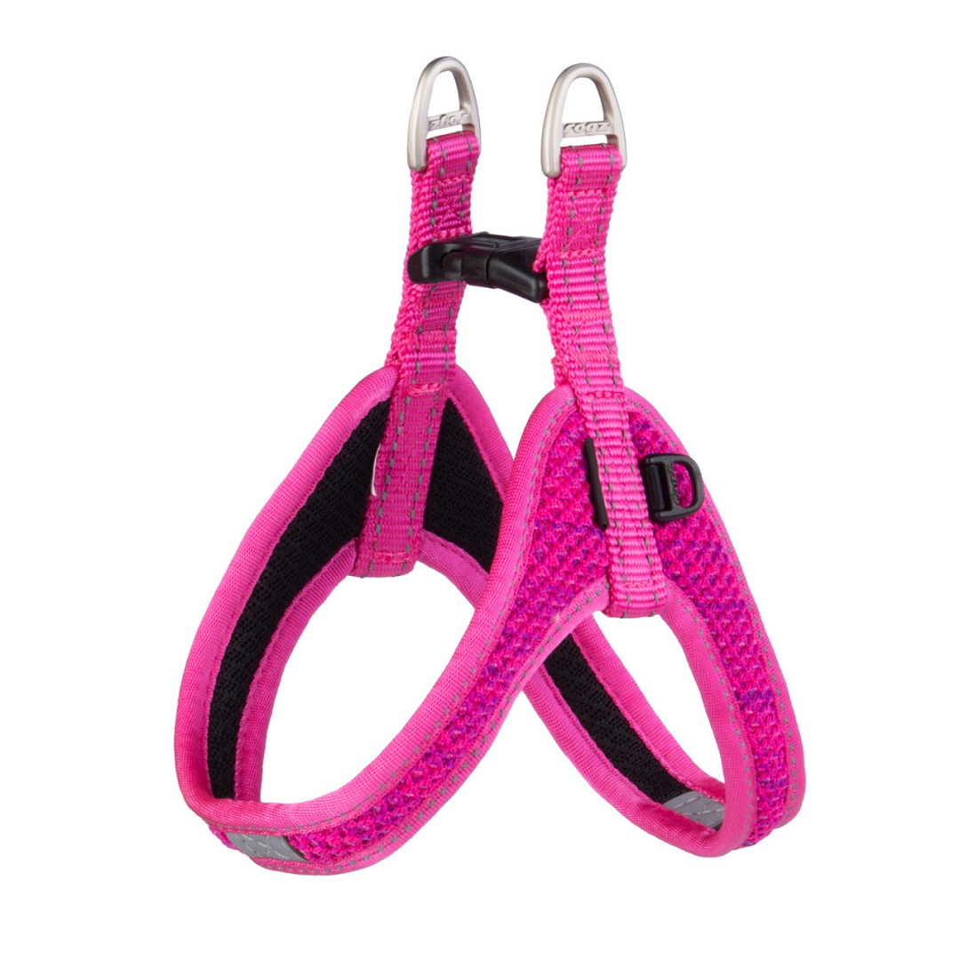 • Plaats beide poten in het midden van het tuig, trek de uiteinden over de schouders en maak de gesp vast.