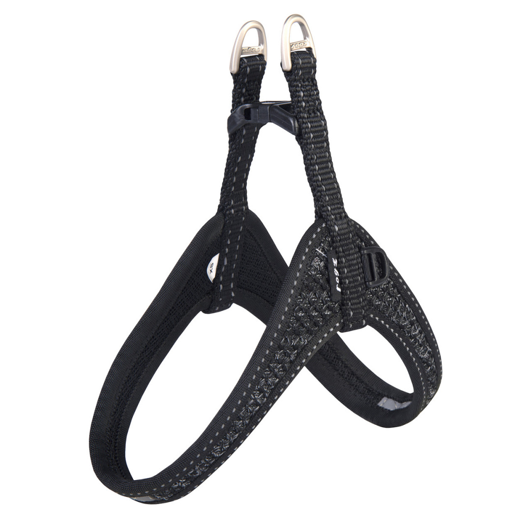 • Plaats beide poten in het midden van het tuig, trek de uiteinden over de schouders en maak de gesp vast.