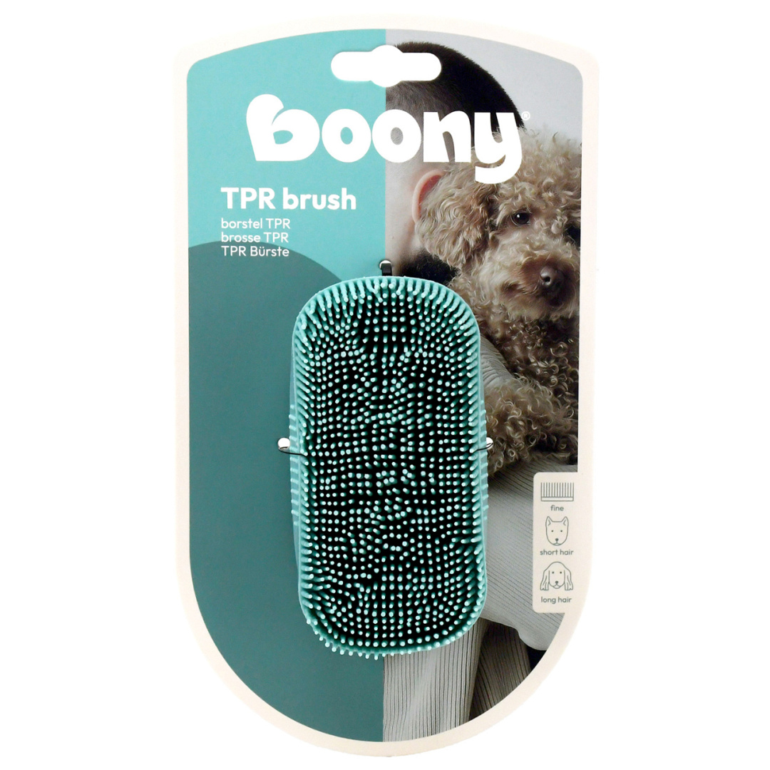 De flexibele, rubberachtige sprietjes van TPR (thermoplastisch rubber) zijn zacht voor de huid, maar stevig genoeg om losse haren, vuil en huidschilfers te verwijderen. Dit maakt de borstel bijzonder geschikt voor honden die snel last hebben van een ge‹rriteerde huid.