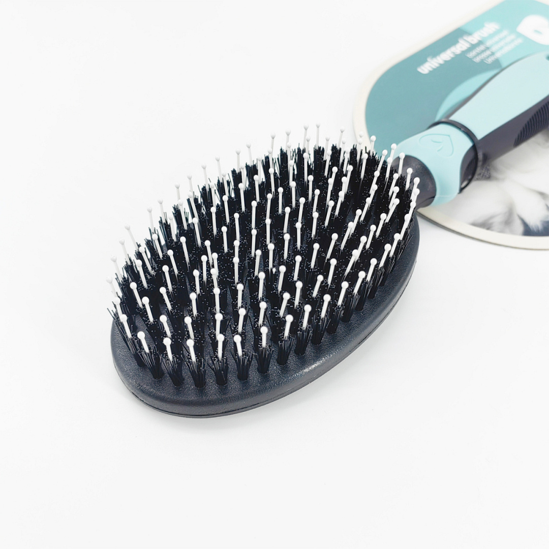 De speciale 'egelhaar'-pinnen dringen diep door in de vacht en verwijderen moeiteloos losse haren, terwijl de nylon haren tegelijkertijd vuil uit de vacht borstelen. Zo verzorg je de vacht grondig in één beweging.