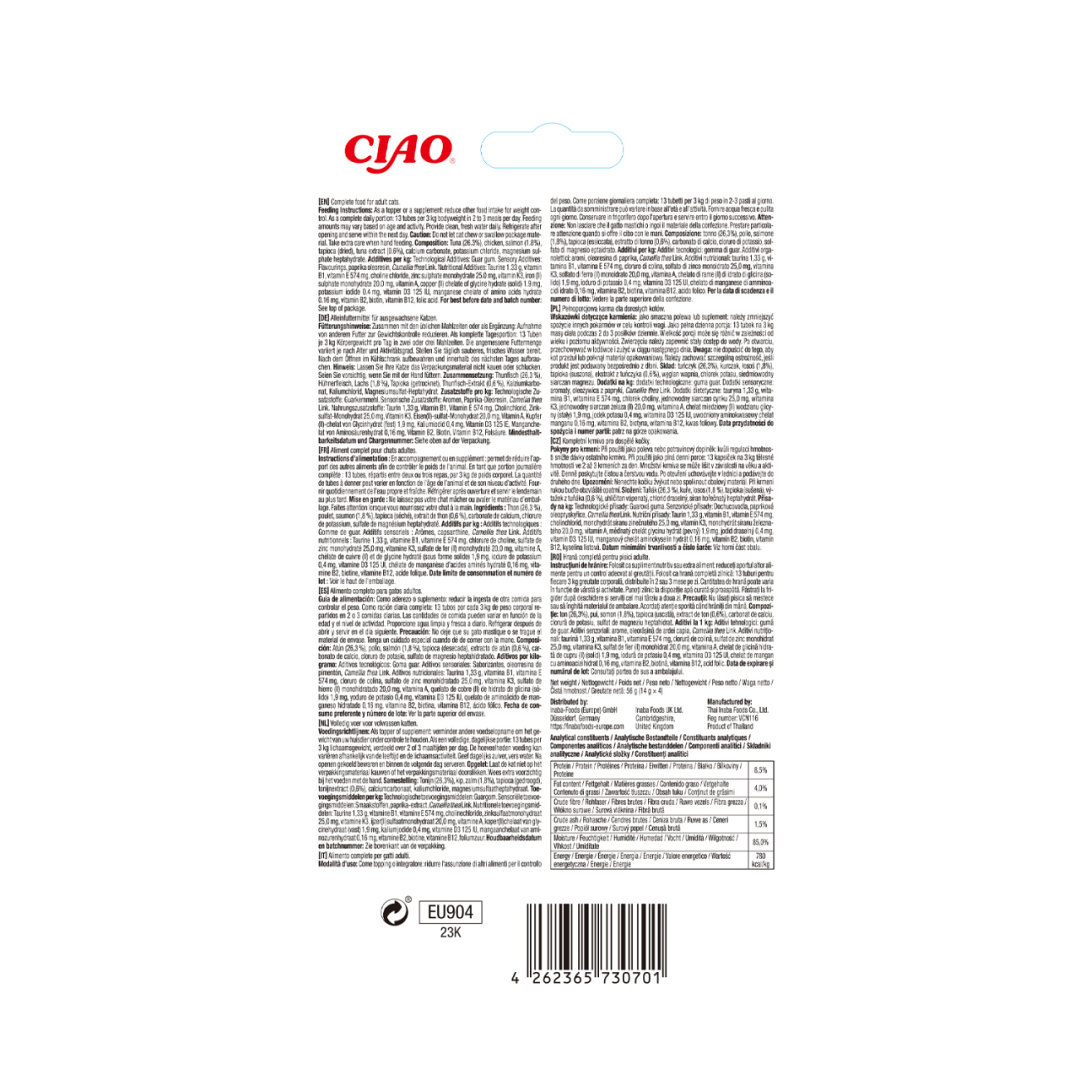 Tonijn (26,3%), kip, zalm (1,8%), tapioca (gedroogd), tonijnextract (0,6%), calciumcarbonaat, kaliumchloride, magnesiumsulfaatheptahydraat. |