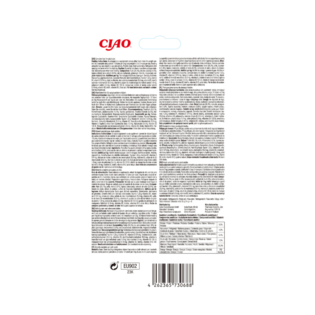 Tonijn (26,3%), kip, sint-jakobsschelp (1,8%), tapioca (gedroogd), tonijnextract (0,6%), calciumcarbonaat, kaliumchloride, magnesiumsulfaatheptahydraat. |