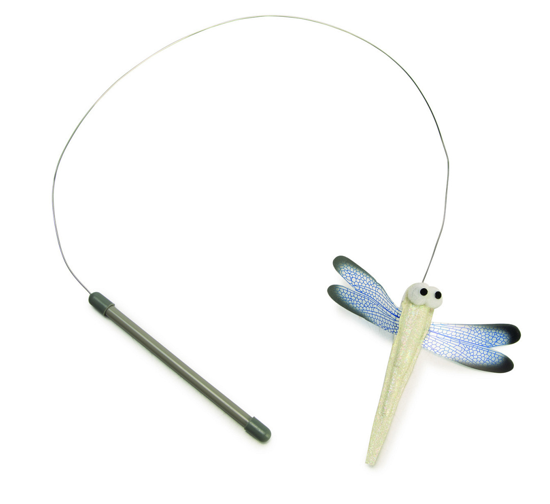 Aan het uiteinde is een libelle bevestigd, die je op deze manier echt kan laten vliegen. Je zult zien dat jouw kitten er met veel plezier achteraan zal gaan.