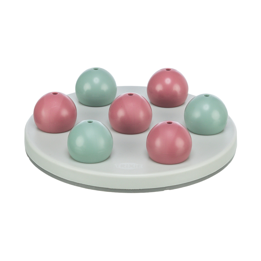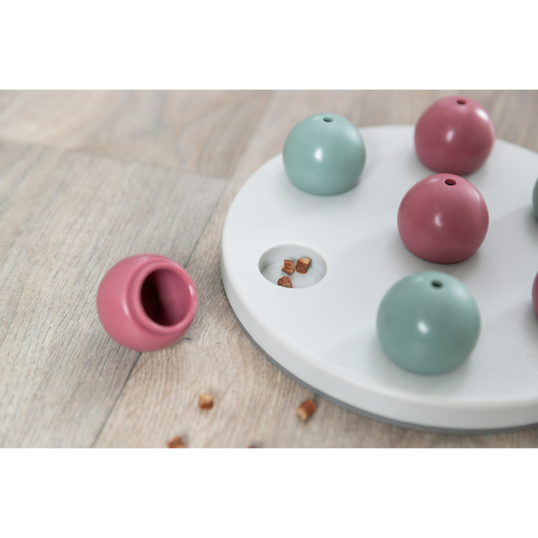 Het spel bestaat uit een schijf met uitsparingen en 7 kunststof afdekbolletjes. Onder deze bolletjes kan je snoepjes of brokjes verstoppen. Doordat er in de bovenkant van elk bolletje een klein gaatje zit, kan je kat de brokjes goed ruiken. Door de bolletjes weg te duwen kan je kat de brokjes, snoepjes of het natvoer opeten. Het spel is ook ideaal voor oudere katten of binnenkatten. Al met al wordt je kat uitgedaagd, eet ze langzamer en eet ze minder, wat allemaal bijdraagt aan een gezonde spijsvertering en een goed gewicht.