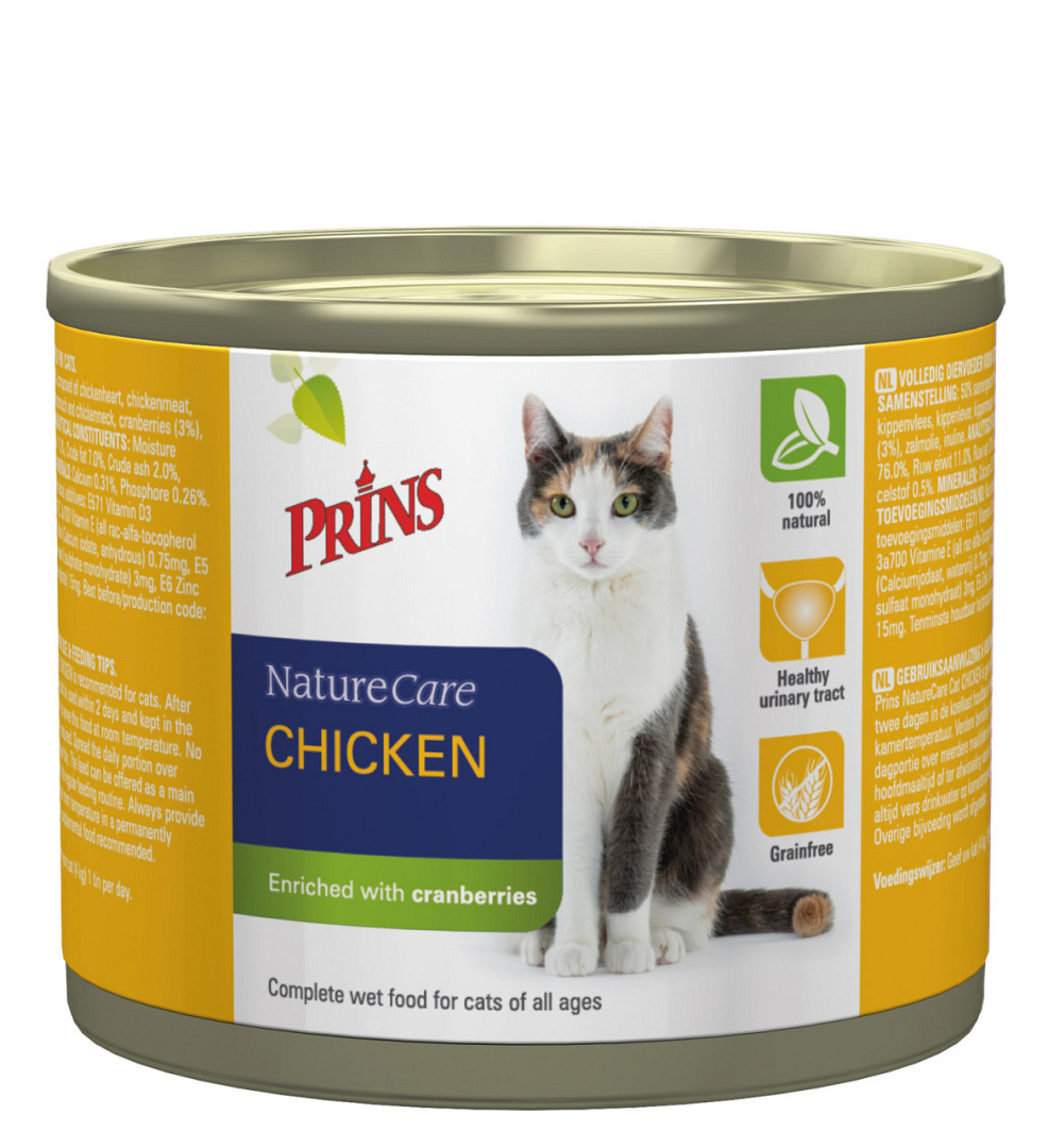 Katten drinken van nature weinig. Voldoende opname van vocht helpt gezonde urinewegen te behouden. Een natvoeding als NatureCare Cat Chicken draagt bij aan een gezond milieu in de blaas. Hoogwaardige grondstoffen als zalmolie, een bron van omega 3-vetzuren, en zink zorgen voor een gezonde en glanzende huid en vacht. NatureCare Cat Chicken bevat kip en is verrijkt met cranberries.