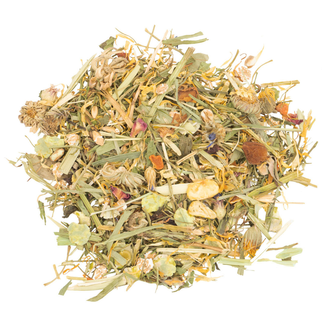 Peterselie 8,5%, havervlokken 8,3%, tarwevlokken, rode biet, erwtenvlokken, luzerne 6,4%, smale weegbree, berkenbladeren, wortels, gousdbloemblaadjes 5%, brandnetel, tarwe, tarwe voorverstijfseld, maisvlokken, mais voorverstijfseld, haverplant, korenbloemblaadjes, melisse, paardenbloem 2%, pepermunt, bergweidehooi, rozenblaadjes, rode klaver blaadjes |
