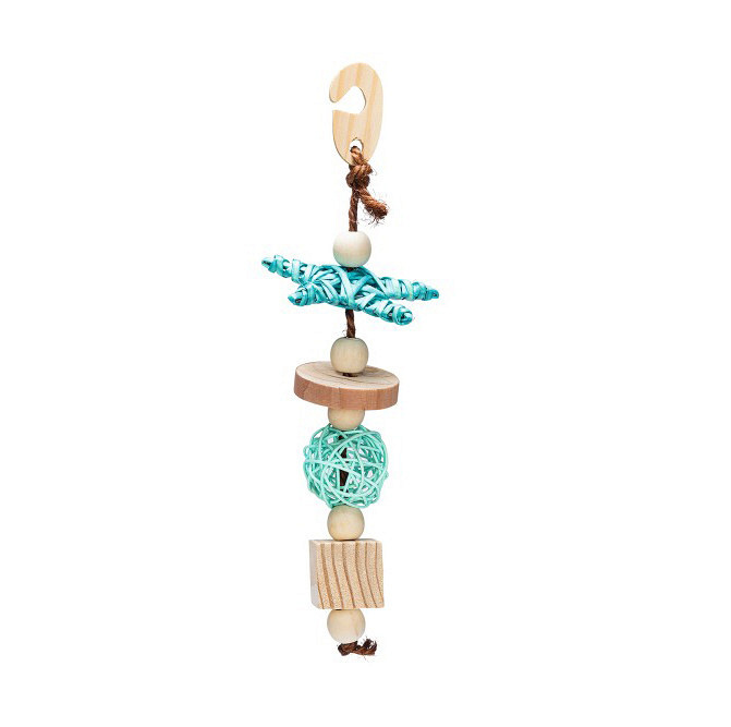 De diverse houten balletjes geven het speeltje een speelse uitstraling. Het touw dat door het speeltje geweven is, is gemaakt van sisal.