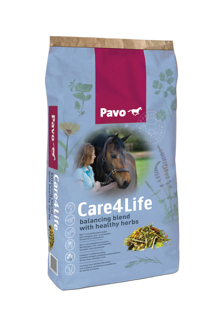 Pavo Care4Life bevat geen stoffen die het systeem onnodig belasten. Het heeft een suiker-zetmeelgehalte van slechts 9%!! Het bevat geen granen of graanbijproducten, is melassevrij en havervrij. Pavo Care4Life past in het rantsoen van ieder paard!